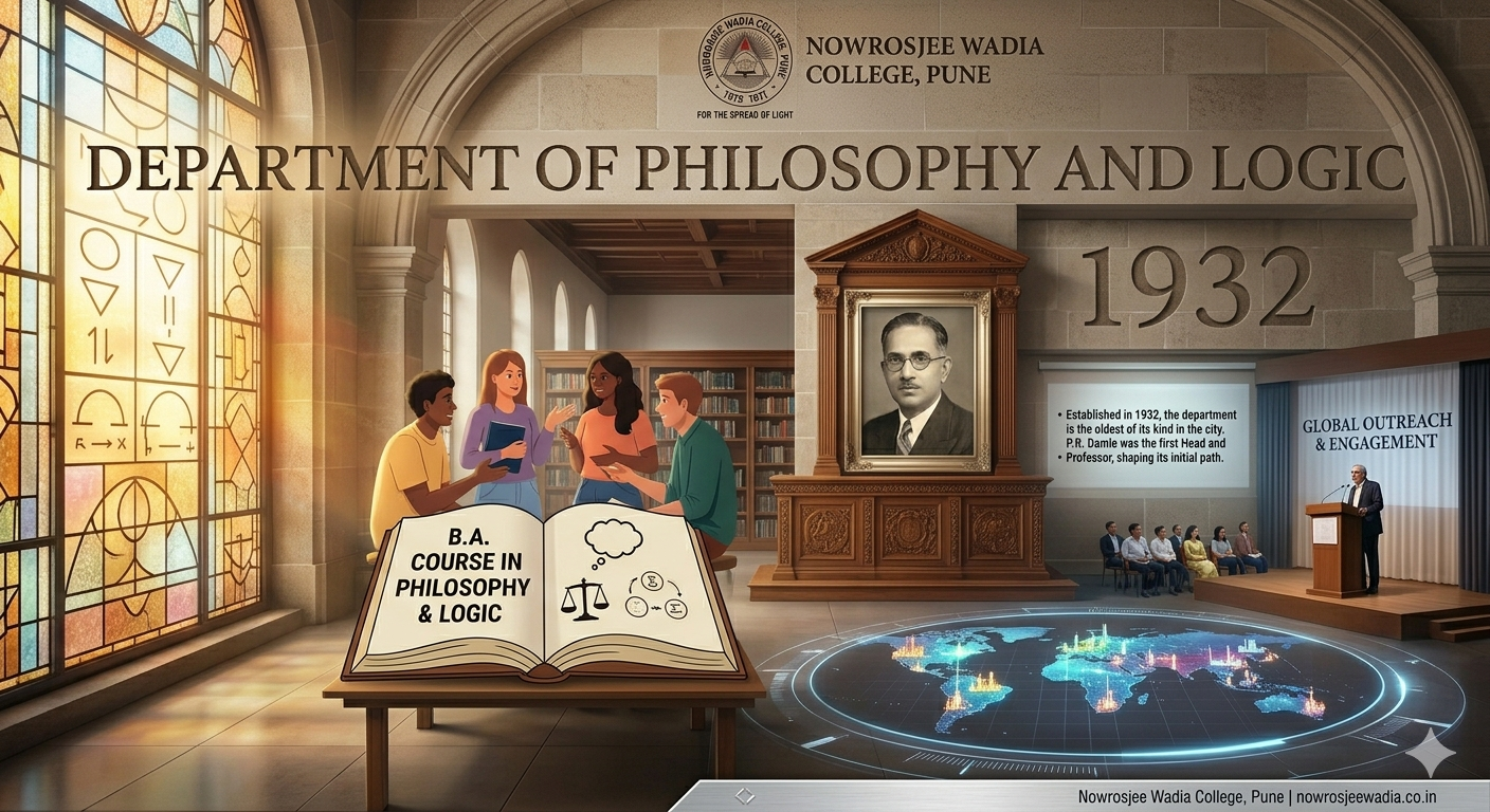 Established in 1932, the Department of Philosophy and Logic has been functioning as a general subject department since the establishment of Nowrosjee Wadia College, the department is the oldest Philosophy Department in the city. P.R.Damle (former Principal), was the first Head of the department and Professor of Philosophy and Logic of this college. The Department offers a course in Philosophy and Logic as general level subjects for the degree of B.A.